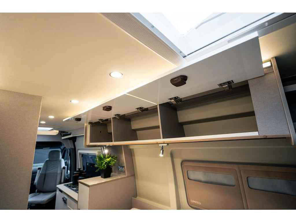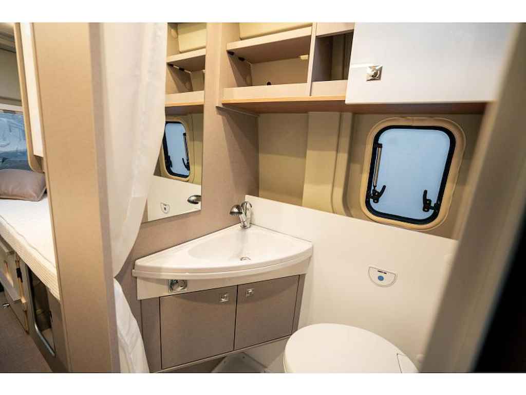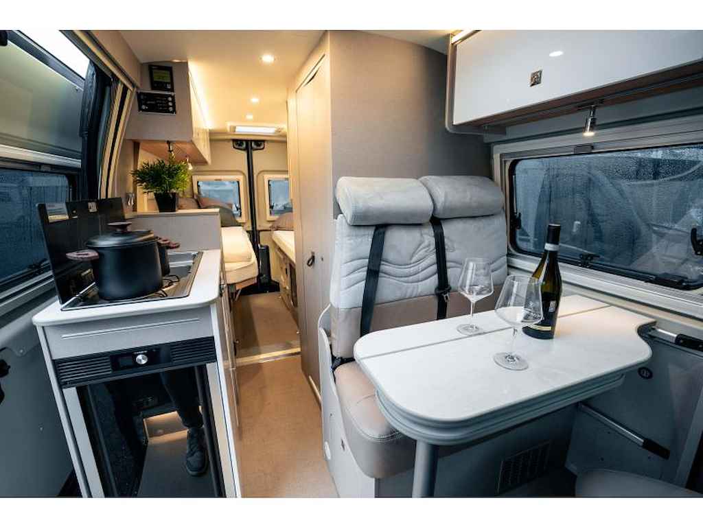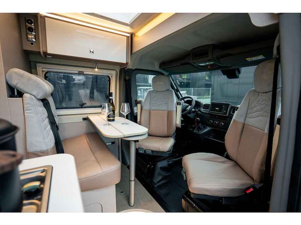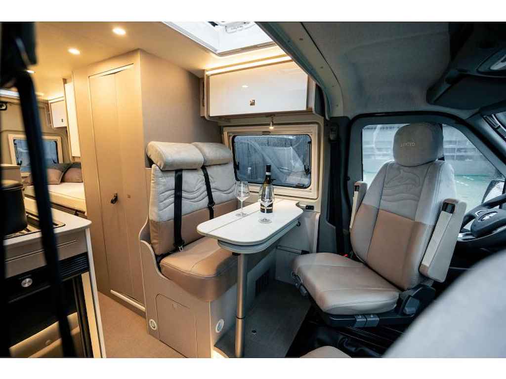 Deze Delfin Limited Edition is ontworpen met oog voor detail. Het interieur biedt sfeervolle LED-verlichting, een inklapbare tafel met draaibaar deel, en slimme opbergoplossingen zoals een multifunctionele hangkast en strategisch geplaatste koelkast die aan beide zijden opent, USB-aansluitingen en meerdere 220V-stekkers zorgen voor extra gemak tijdens je reizen.