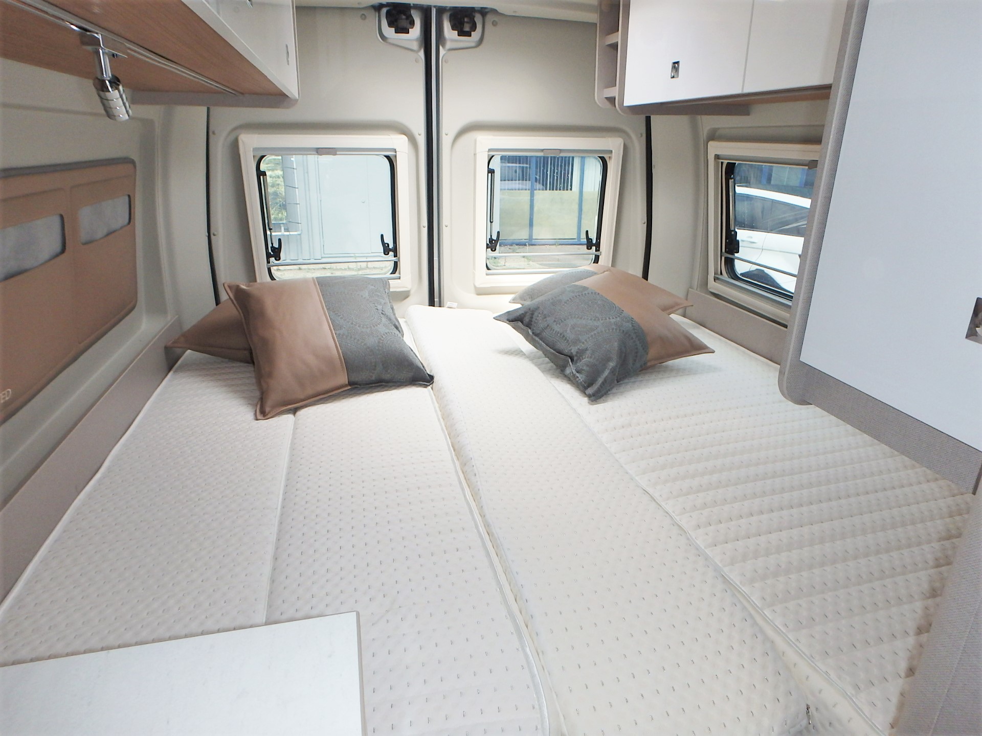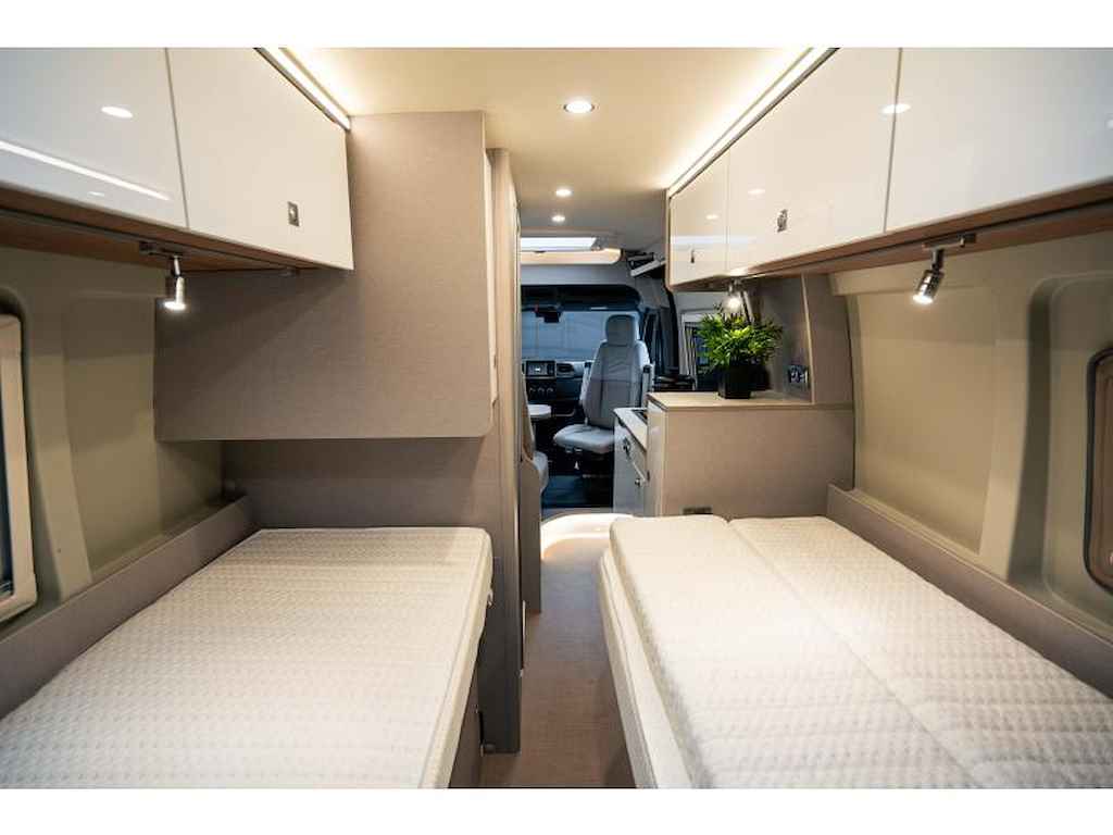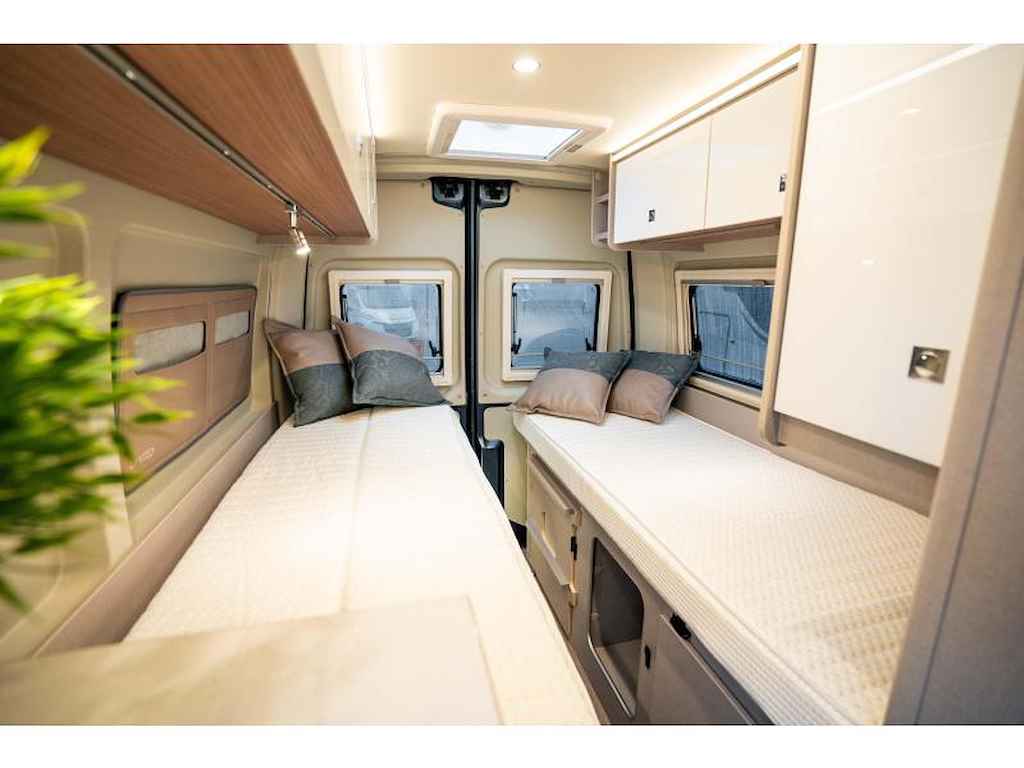 De slaapkamer is het hart van de camper en biedt twee comfortabele twinbedden van 72 cm breed met multizone comfortschuimmatrassen. Deze kunnen eenvoudig worden omgevormd tot een ruim tweepersoonsbed of opgeklapt worden om extra kofferruimte te creëren.