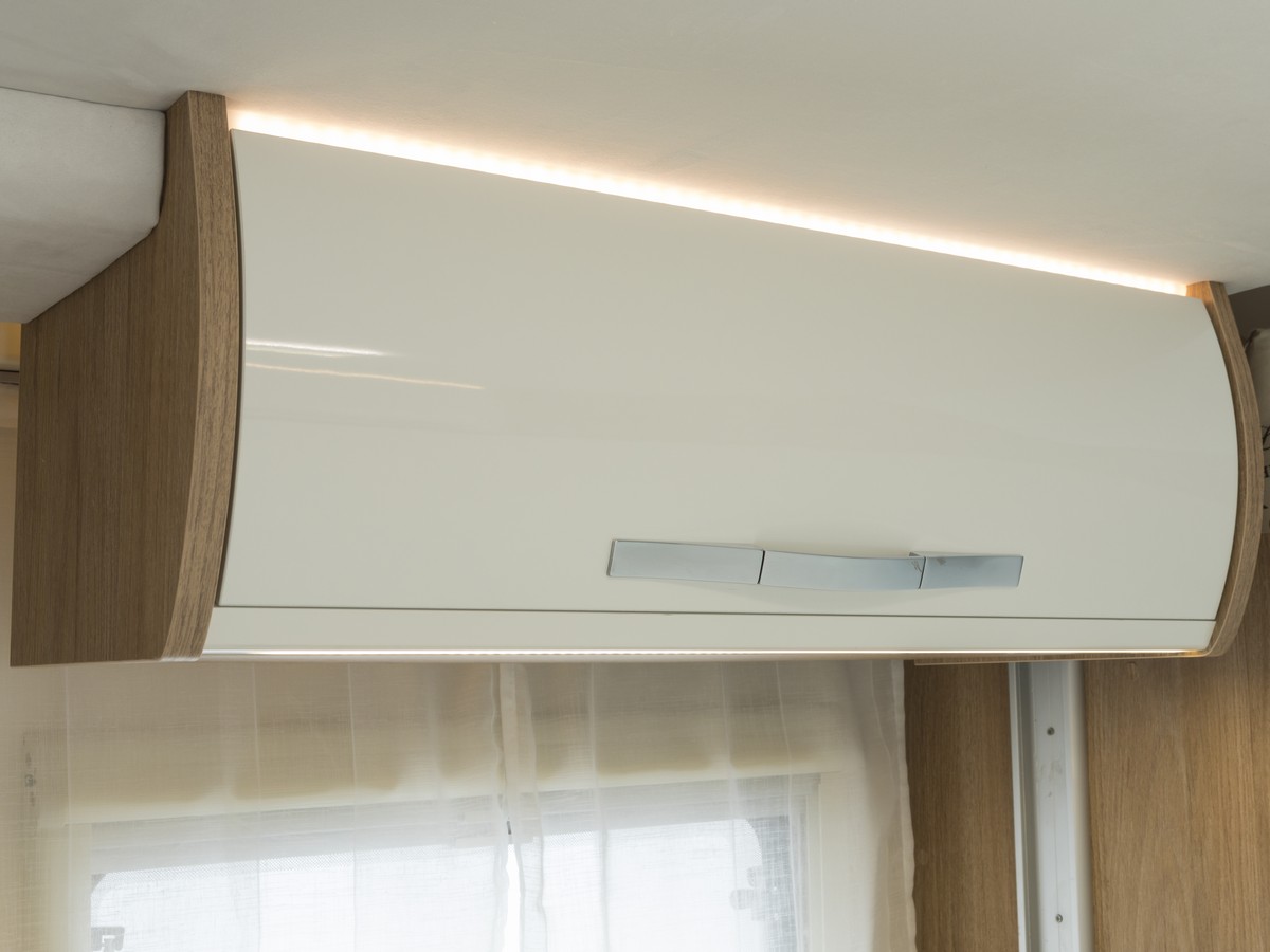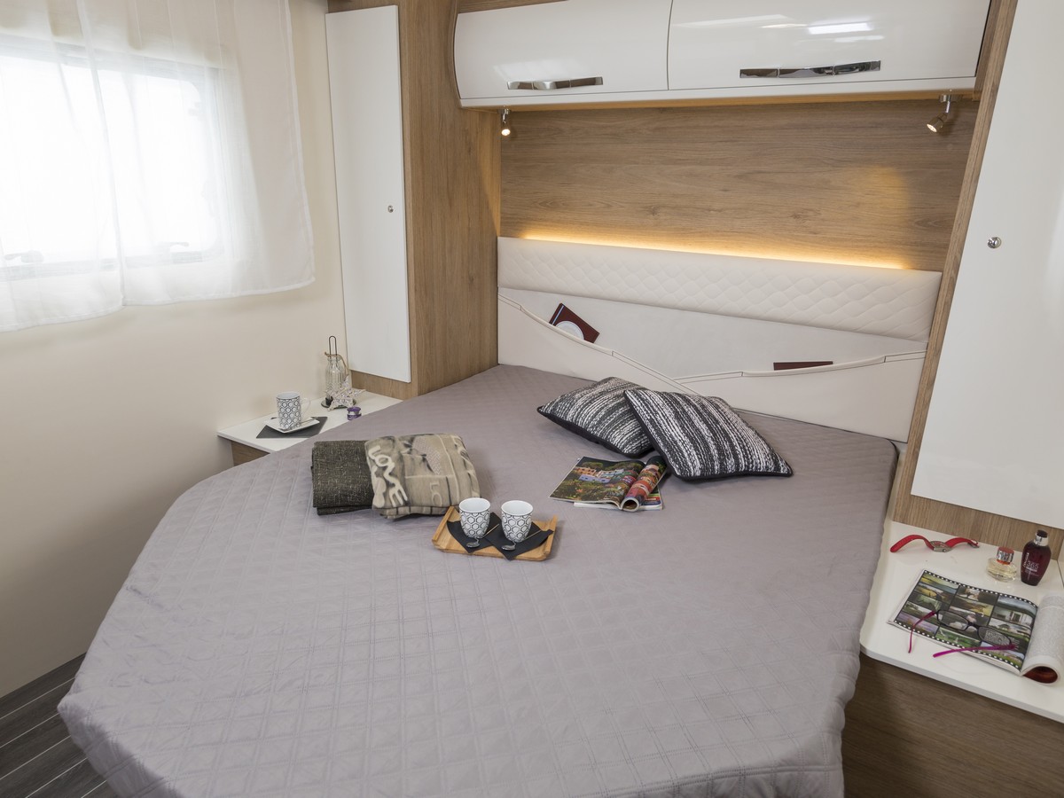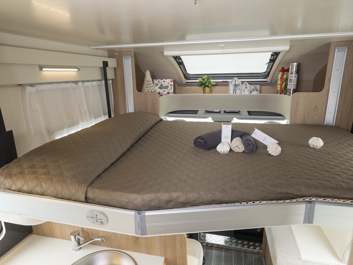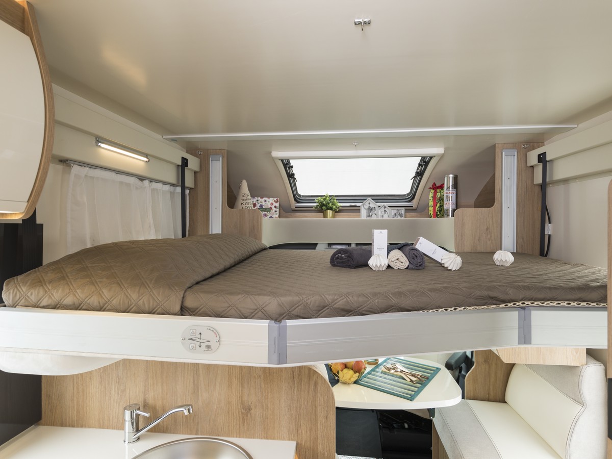 - Elektrisch plafondbed boven salon met lattenbodem en doordacht ventilatieconcept.