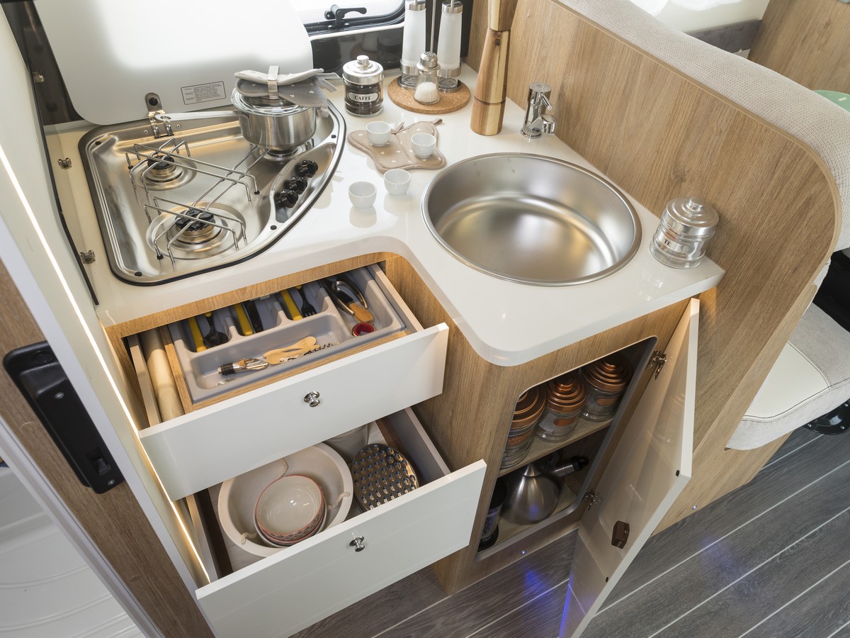 - Slimme opstelling kookplaat en spoelbak die zorgt voor een handige vrije werkruimte.